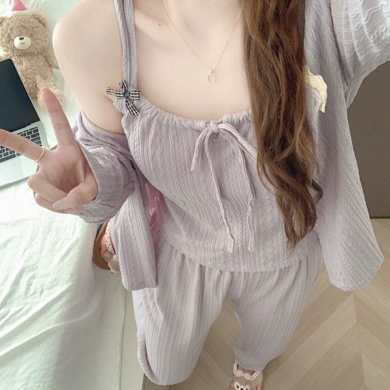 纯欲风带胸垫睡衣女春秋季新款长袖长裤吊带性感甜美家居服三件套